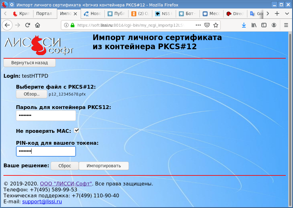 Первый способ предполагает, что у пользователя уже имеется личный сертификат, который хранится в защищенном контейнере PKCS#12 . В этом случае необходимо просто установить личный сертификат из контейнера PKCS#12 на токен:
